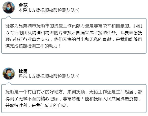 抚顺本轮疫情发生后,在省疫情防控指挥部统筹调配下,省直医疗单位和沈阳、大连、本溪、丹东、锦州、辽阳等兄弟城市139名专业队员组成的6支核酸检测队伍,闻令而动、逆行出征,义无反顾驰援抚顺疫情防控最前沿。队员们不辞辛苦、不惧风险,每天超负荷工作,夜以继日、坚守岗位,以严谨细致的作风和极端负责的态度,高标准、高质量完成了最紧迫、最重要的检测工作,为疫情处置争得了先机、赢得了主动,为我市抗疫工作增添了信心和力量,展现出了大爱无疆的医者仁心,弘扬了伟大抗疫精神。