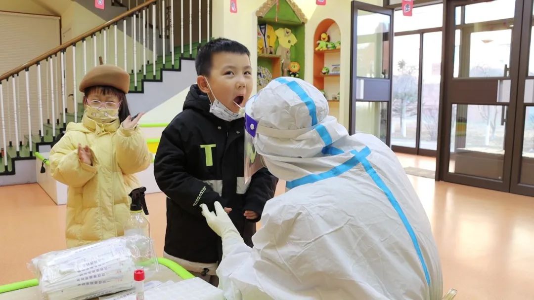 在顺城区东华园社区伟才幼儿园,园内保健医正在为孩子们进行核酸检测,大家都严格按照防疫要求有序排队、佩戴口罩,顺利完成了此次高质量全员核酸检测。